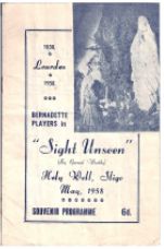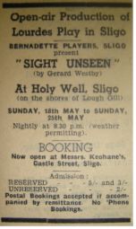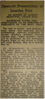 A cast of almost fifty, a thirteen piece orchestra, forty members of Sligo Oratorio Society, a large group of backstage helpers and an organising committee took on the task of presenting in dramatic format the apparitions at the grotto at Massabielle. The task of mounting such a production was immense as Tobernalt is set into a hill in the middle of the countryside. A stage had to be built, electricity had to be sourced, amplification and lighting had to be erected and costumes had to be hired. It was no mean feat for rural Ireland in the 1950's.